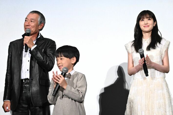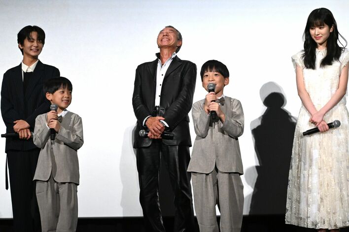 左から)本広克行監督、小沢仁志、飯島直子、齋藤潤、前山くうが、柳葉敏郎、前山こうが。福本莉子、筧利夫、矢本悠馬