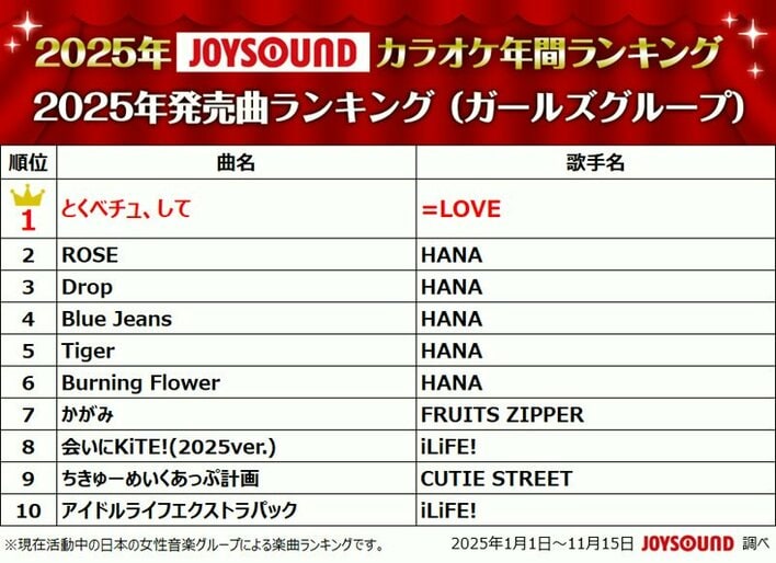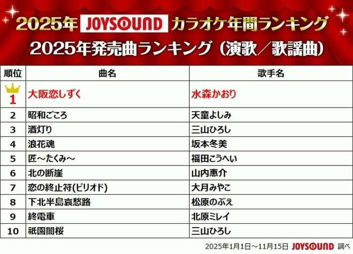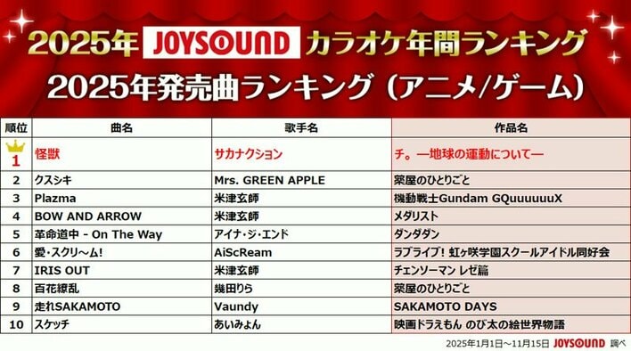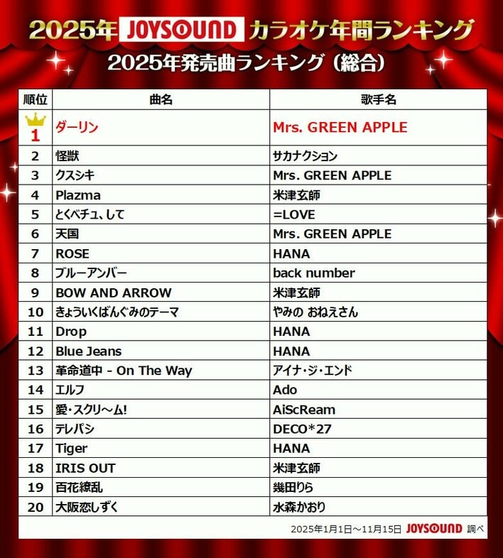 2025年カラオケ年間ランキング Mrs. GREEN APPLEが圧巻の“四冠”達成 ドラマ主題歌部門では『あなたを奪ったその日から』主題歌や『波うららかに、めおと日和』の主題歌がランクイン