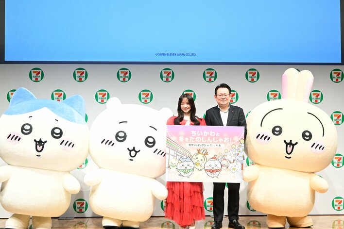 森香澄のもとにちいかわ&ハチワレ&うさぎがサプライズ登場!セブン‐イレブンと「ちいかわ」とのコラボ発表会