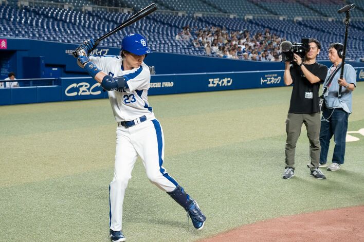鈴木伸之 バットを振りぬいた渾身の一発!観客役として参加していたエキストラがドッと沸く見事な放物線