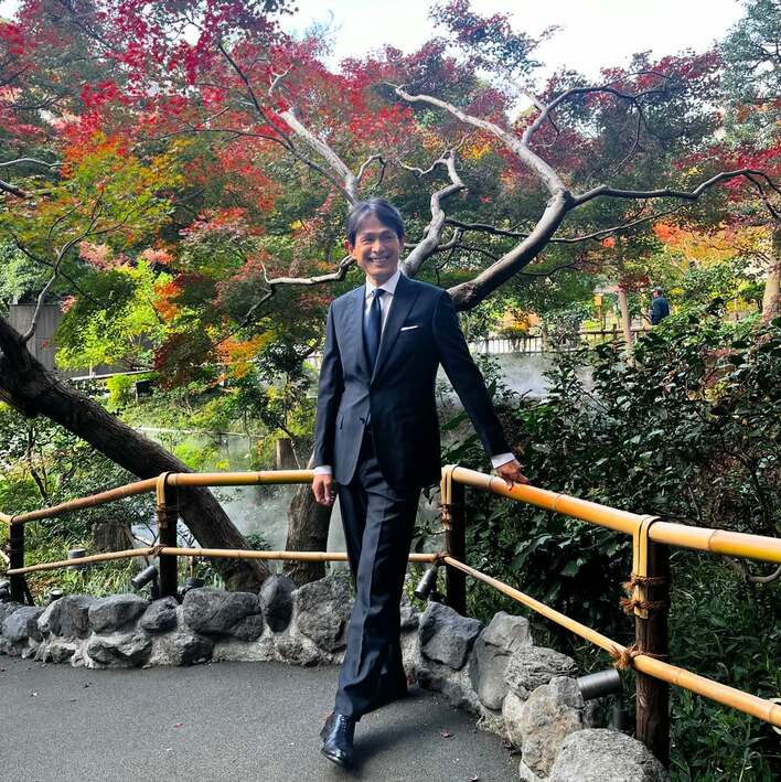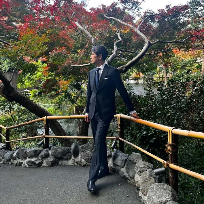 「額縁に入れて飾りたい」江口洋介 紅葉を背にスタイル抜群の黒スーツ姿披露!スラッと伸びる長い脚&爽やか笑顔にファンメロメロ♡