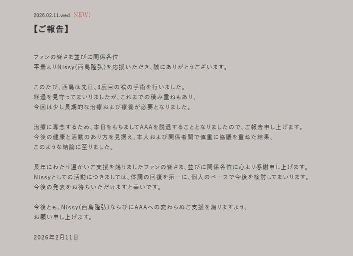 【全文掲載】Nissy(西島隆弘) AAA脱退を発表 4度の喉の手術を経て「長期的な治療および療養が必要となりました」ソロ活動は「個人のペースで今後を検討」
