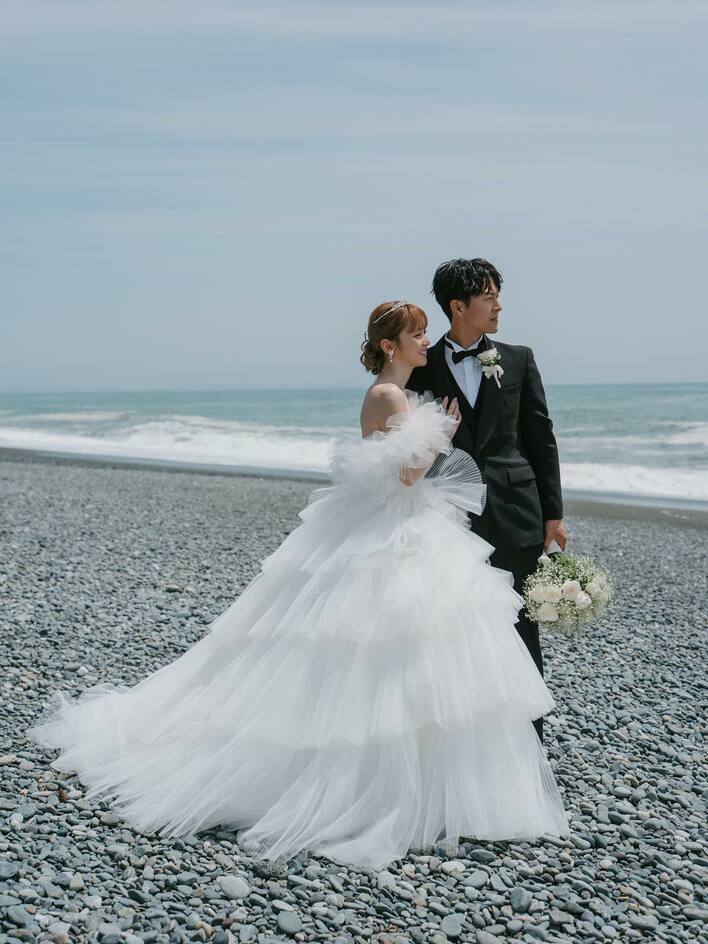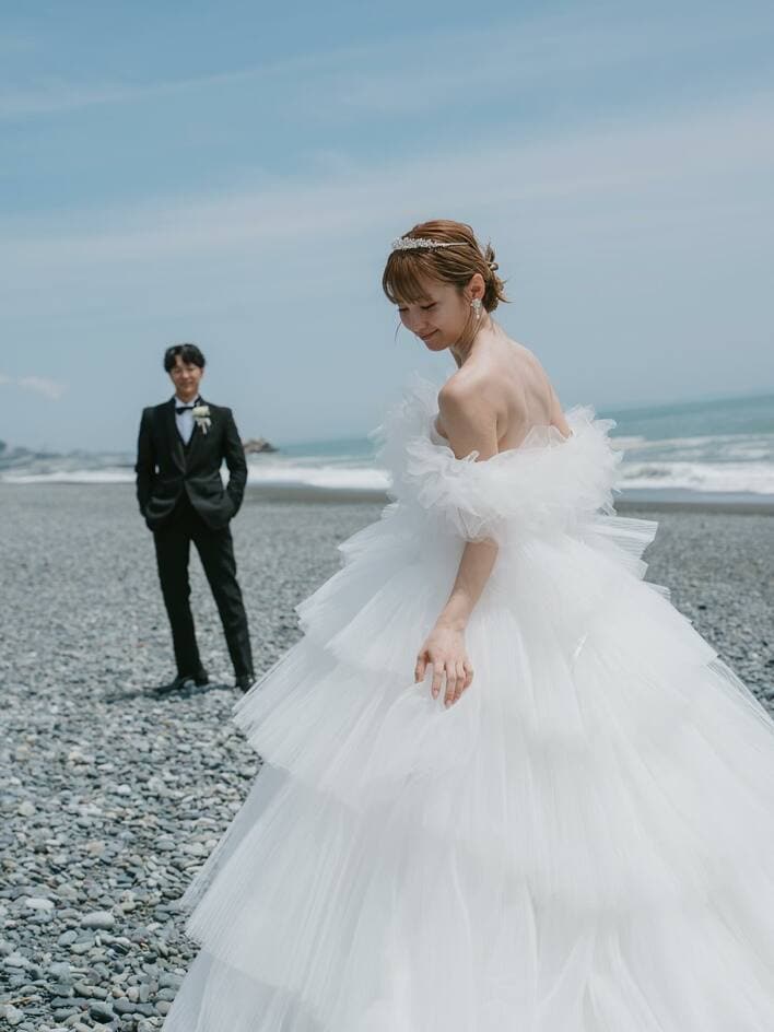「優しい眼差しの旦那様」Dream Ami 結婚6周年で夫とのウェディングフォト公開!海をバックにエスコートされる姿に「本当にお似合い」