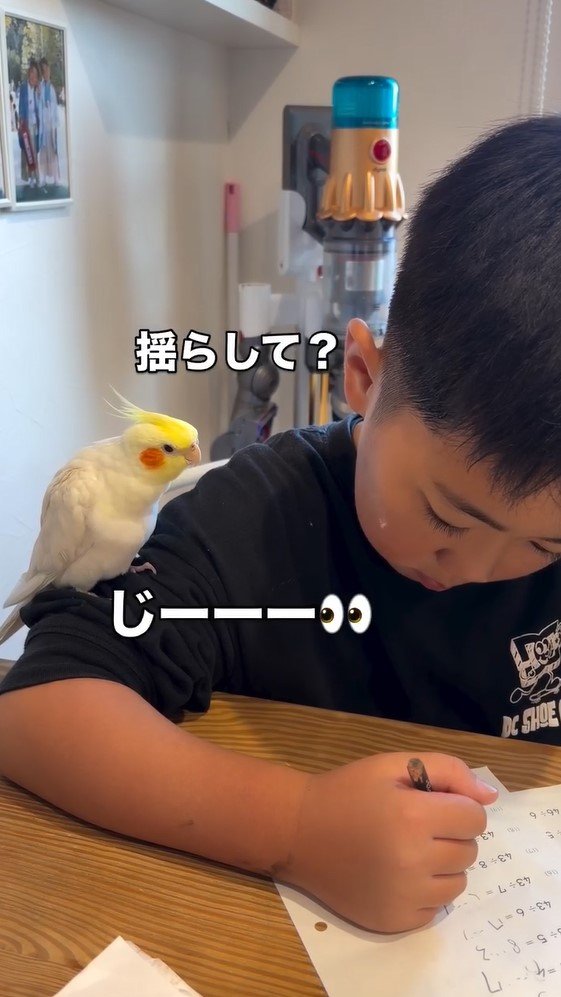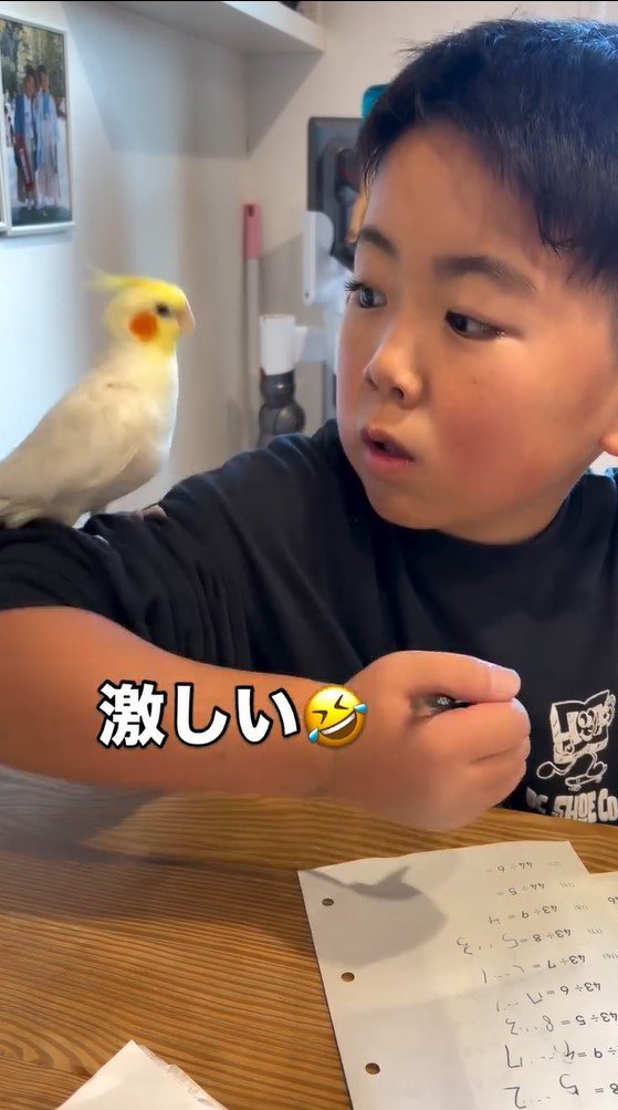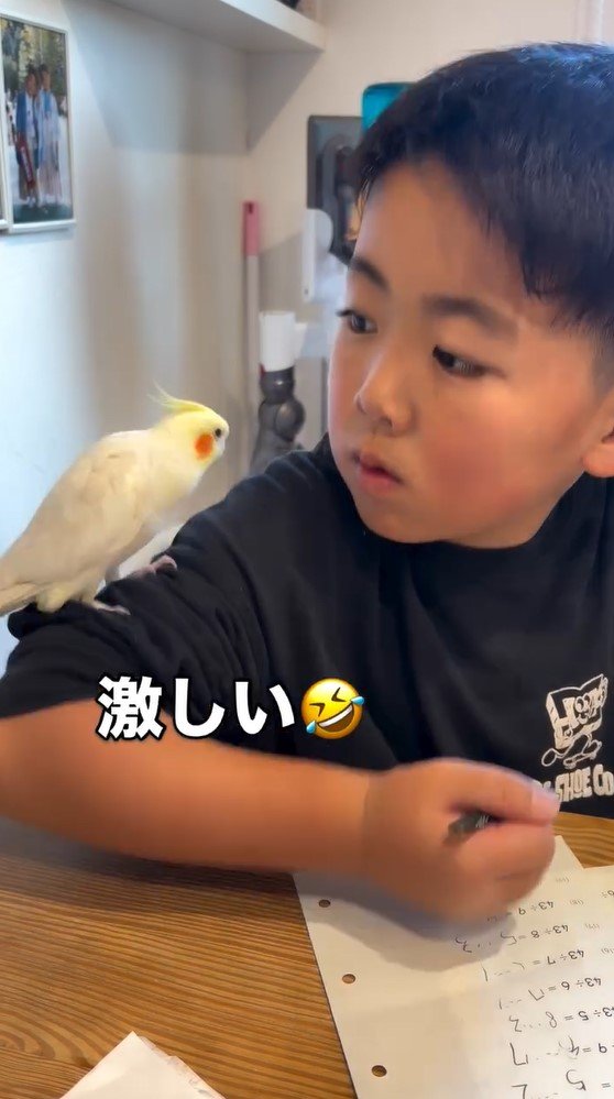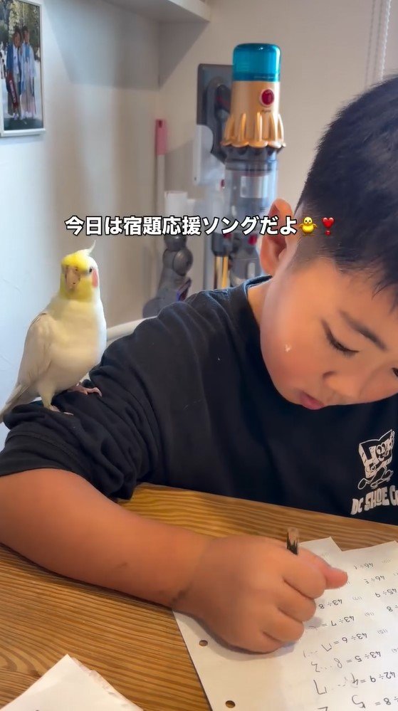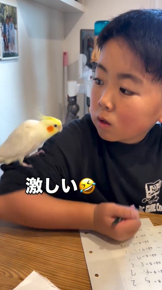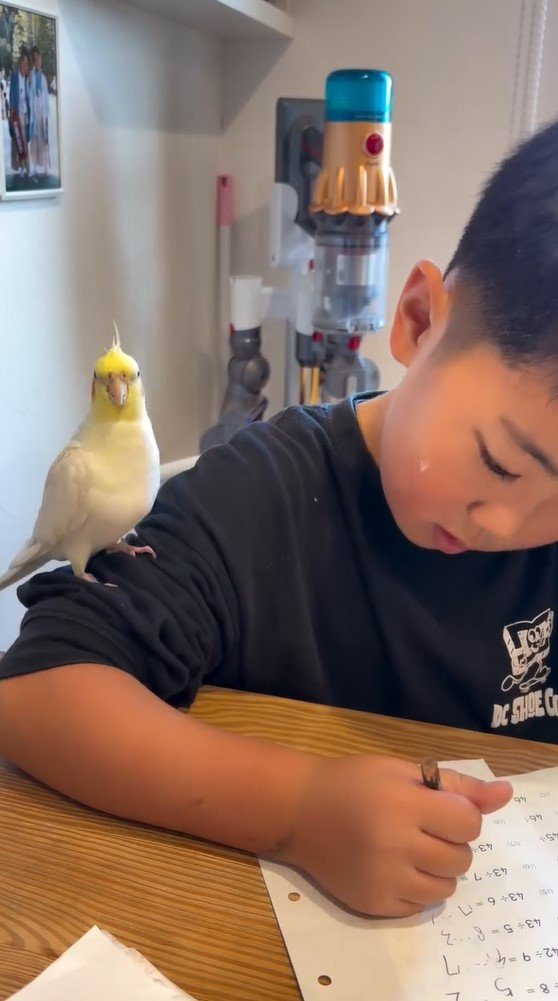 「笑いとまらん」男の子の宿題を邪魔するオカメインコに反響!熱視線を送り遊んでもらう姿に「どっちも天使?」【激かわアニマル&キッズ奇跡の瞬間】
