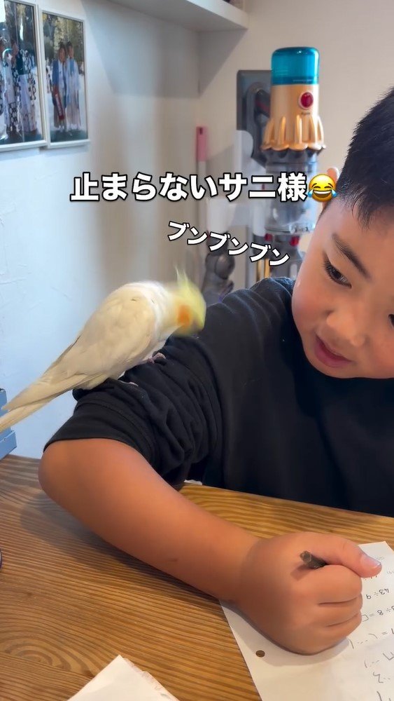 「笑いとまらん」男の子の宿題を邪魔するオカメインコに反響!熱視線を送り遊んでもらう姿に「どっちも天使?」【激かわアニマル&キッズ奇跡の瞬間】