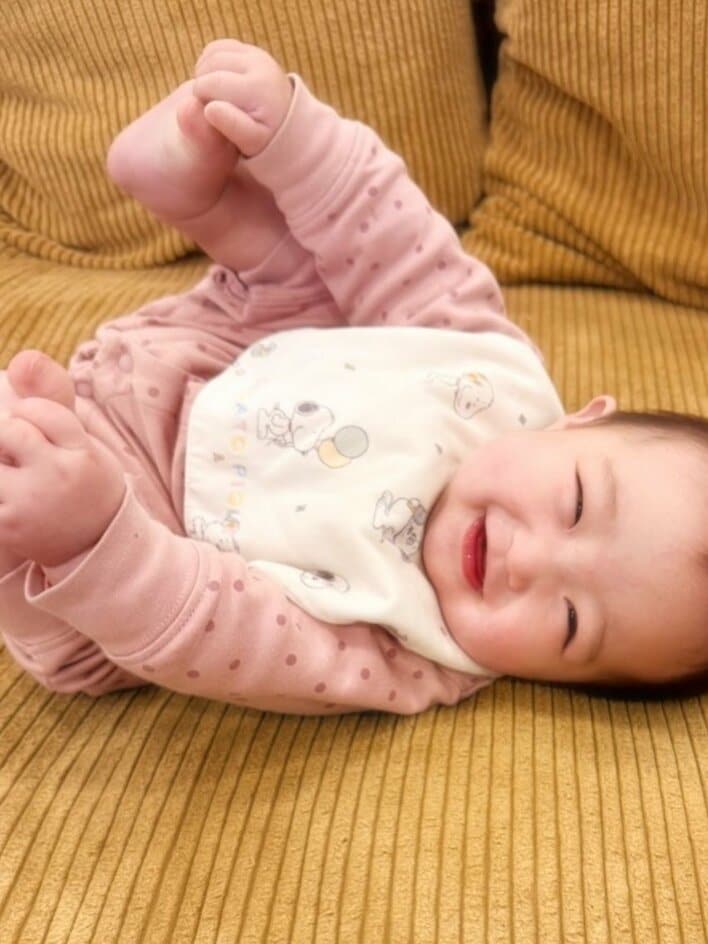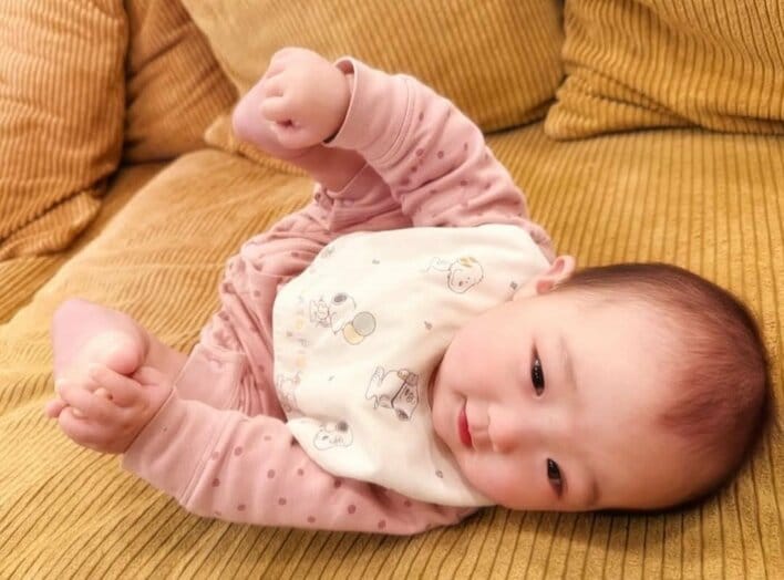 辻󠄀希美の夫・杉浦太陽 生後6ヵ月次女が自分の足を発見!コロンと横になりお気に入りポーズで笑顔を浮かべたかわいすぎる姿にキュン!