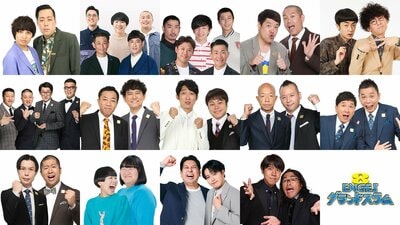 上段左から)エバース、ココリコハナコ、ジャパン、タカアンドトシ、たくろう 2段目左から)チョコンヌ、ナイツ、NON STYLE、バイきんぐ、爆笑問題 3段目左から)ハライチ、ヨネダ2000、レインボー、ロッチ