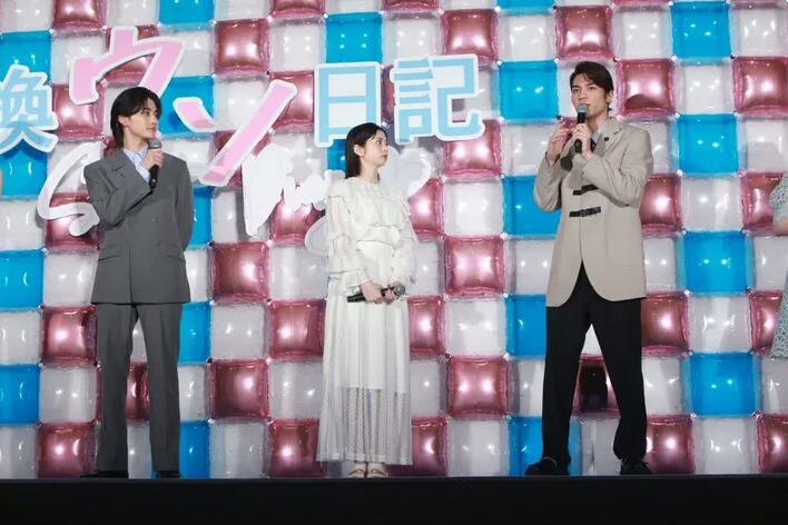左から)竹村謙太郎監督、曽田陵介、茅島みずき、高橋文哉、桜田ひより、板垣瑞生、齊藤なぎさ
