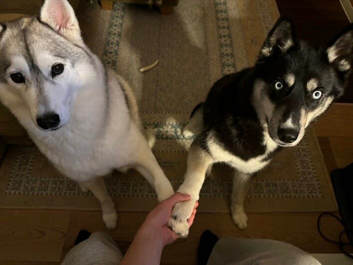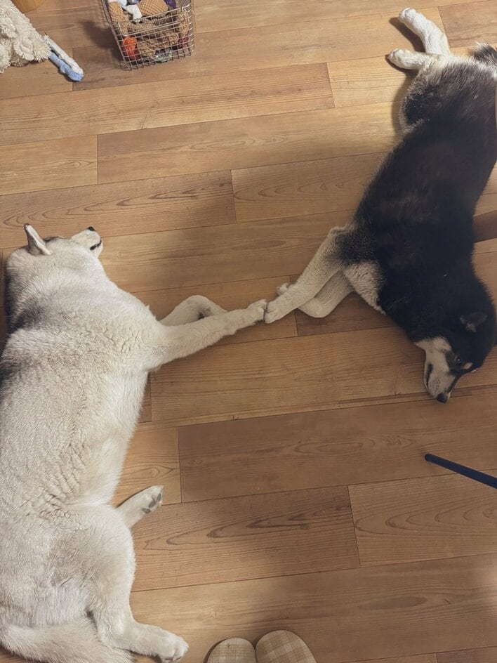「何じゃその体勢w」“どすこいハスキー”にSNS驚愕!相手のワンコに向かって笑顔でポーズを決める姿に「強そう笑」と反響【激かわアニマル奇跡の瞬間】