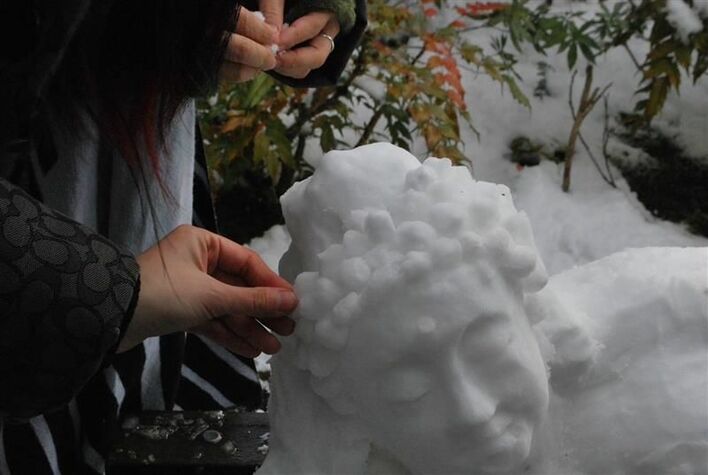 「こりゃブッタまげた!」大学のベンチに現れたのは…?雪遊びの延長で生まれた作品に「溶けてしまうのはもったいない…」と大反響!