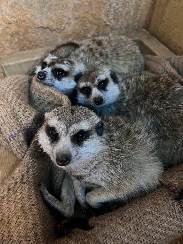 仲良く暖をとるミーアキャット三兄弟 (一番左)リアフくん(真ん中)リノくん(一番右)クリップくん 提供:那須どうぶつ王国