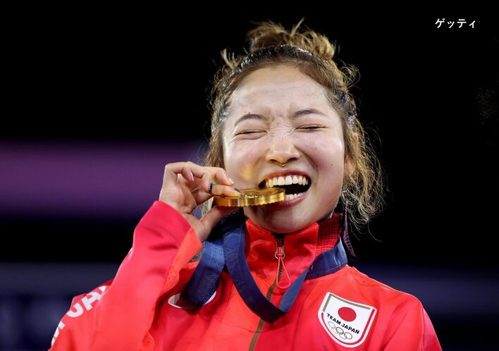 金メダルを噛み締めるAMI選手