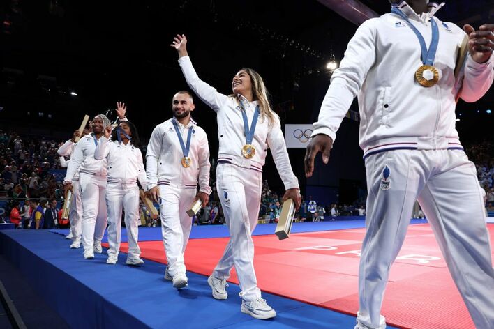 「表彰台長すぎて草」総勢49人がズラリ!写真に入りきらない驚きの光景がSNSで話題 柔道混合団体【パリ五輪】