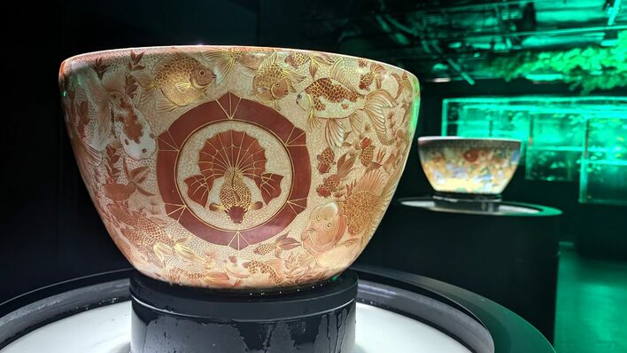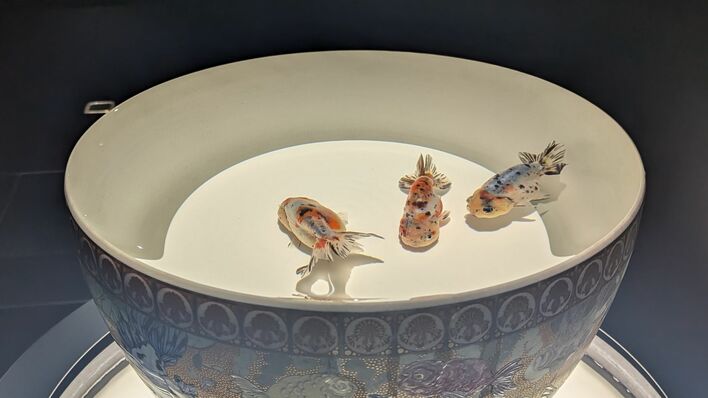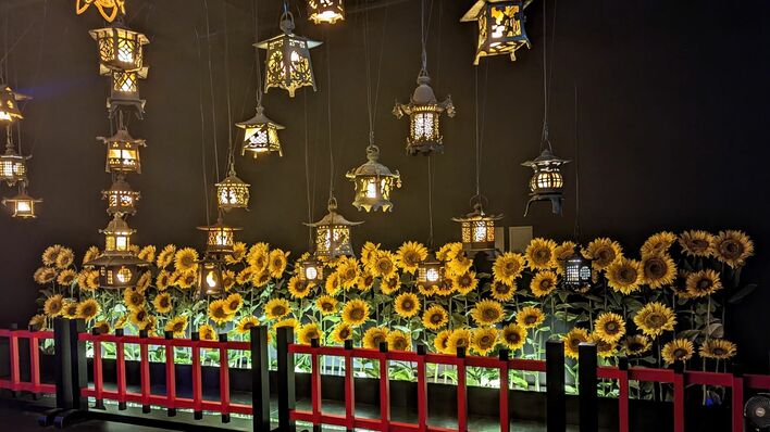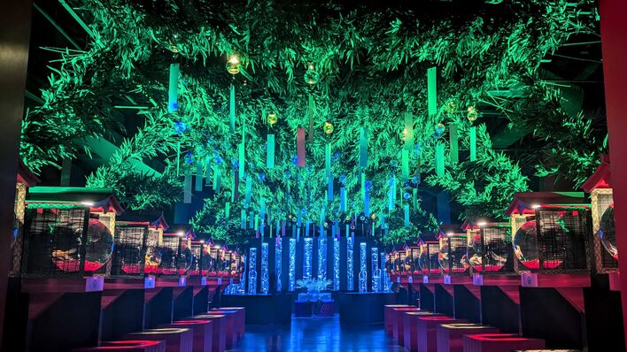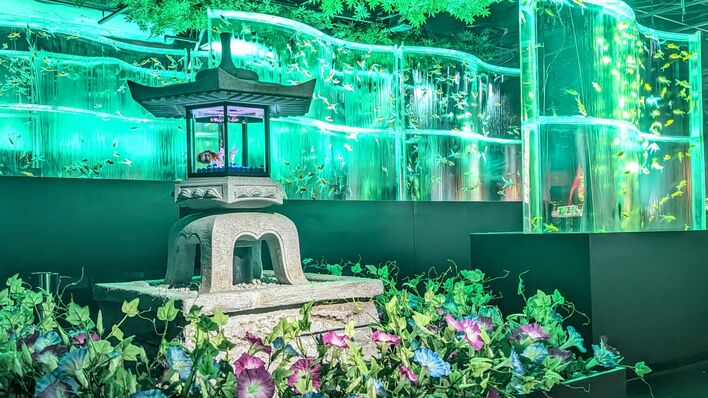 風鈴の音、両サイドの提灯風の水槽で泳ぐ金魚を楽しむ「提灯リウム」