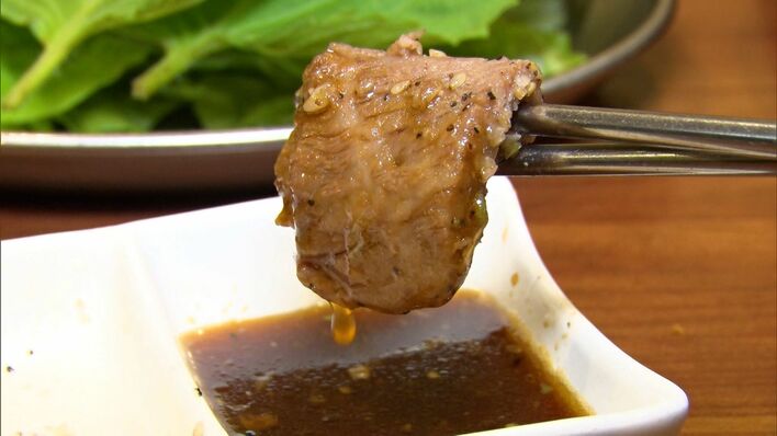 大森南朋さんおすすめの「もみカルビ」をチーズにつけた様子