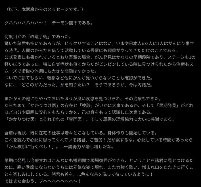 デーモン閣下 早期のがん見つかり手術したことを発表「心配している時間があったらがん検診に行くべし!」と呼び掛け