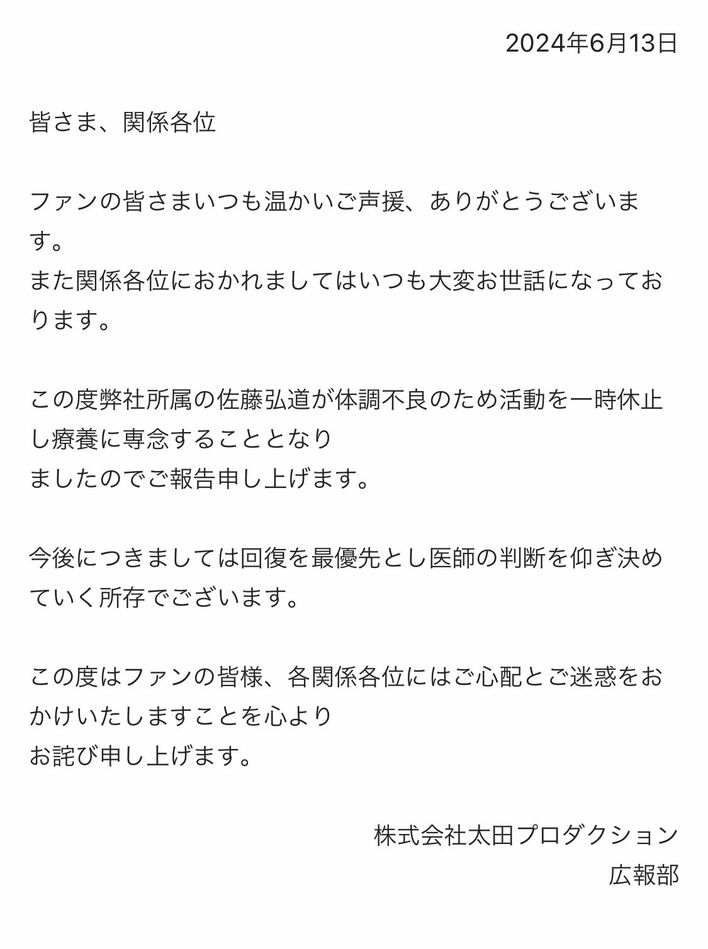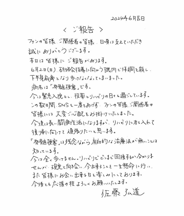 佐藤弘道(55) 一時活動休止を発表 【直筆コメント】「脊髄梗塞」による下半身まひで現在は「投薬とリハビリの日々」