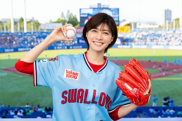 内田有紀 30年ぶりの始球式で超美脚&キュートなユニフォーム姿を披露!投球はワンバンながらも「1000点です」