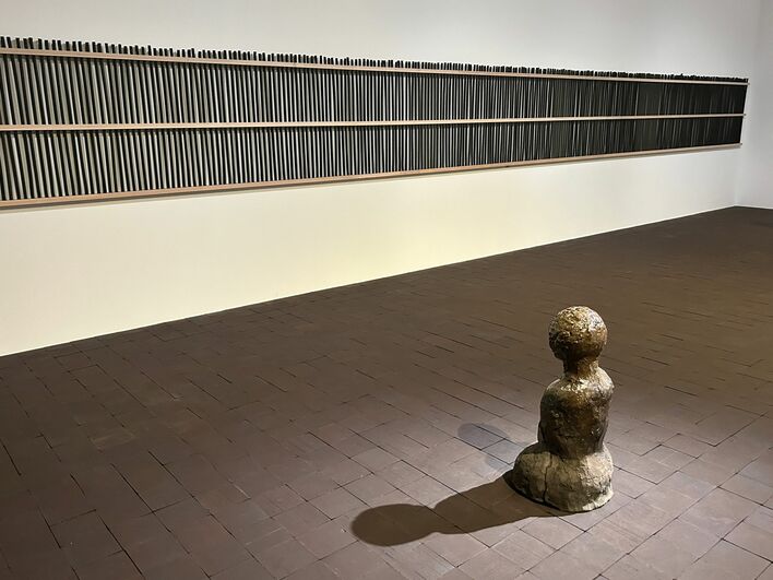 床のレンガは常滑焼、奥にはお香を使った作品が