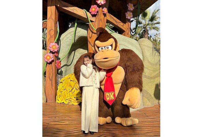 「嫉妬しちゃう!」福原遥 USJ新エリアに降臨!ドンキーコングが“ハグ”!?カチューシャ姿で無邪気に楽しむ様子公開