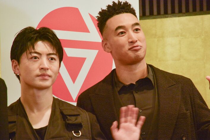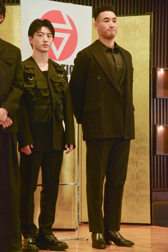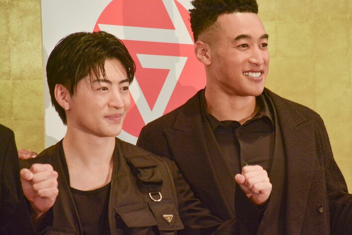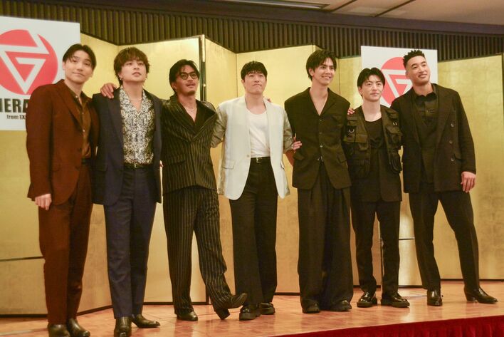 左から)小森隼、⽩濱亜嵐、数原⿓友、中務裕太、⽚寄涼太、佐野玲於、関⼝メンディー