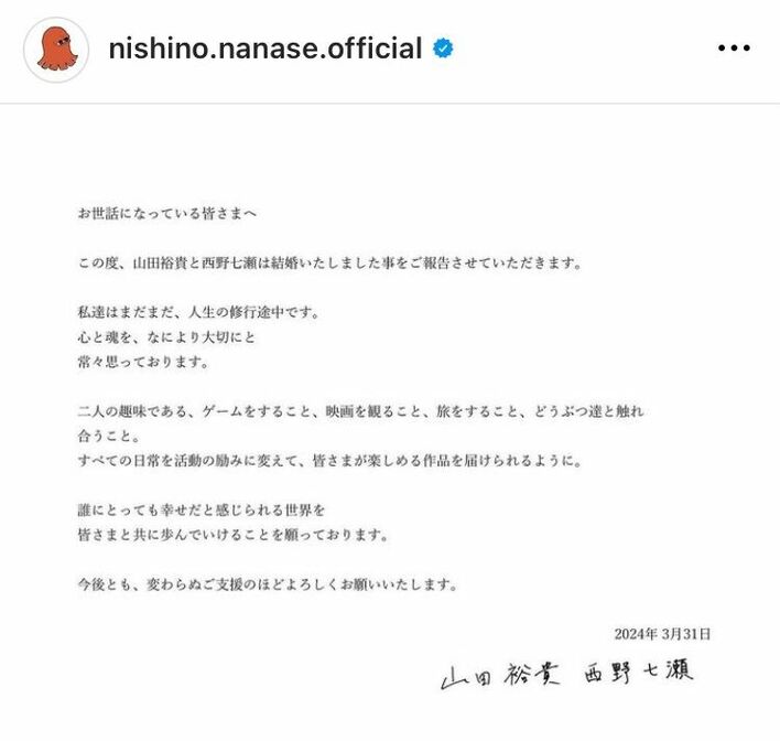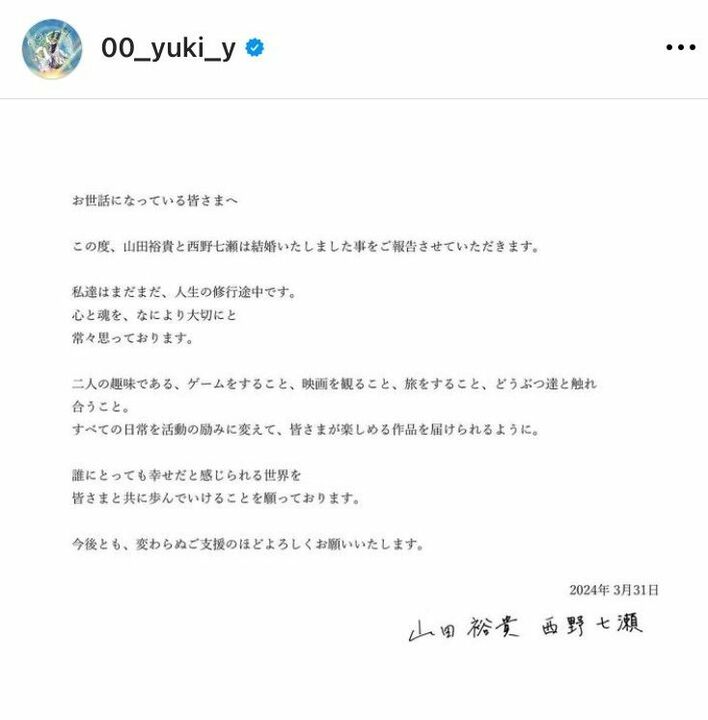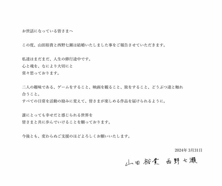 【速報】山田裕貴と西野七瀬が結婚を発表【2人のコメント全文掲載】共通の趣味明かす「すべての⽇常を活動の励みに変えて」