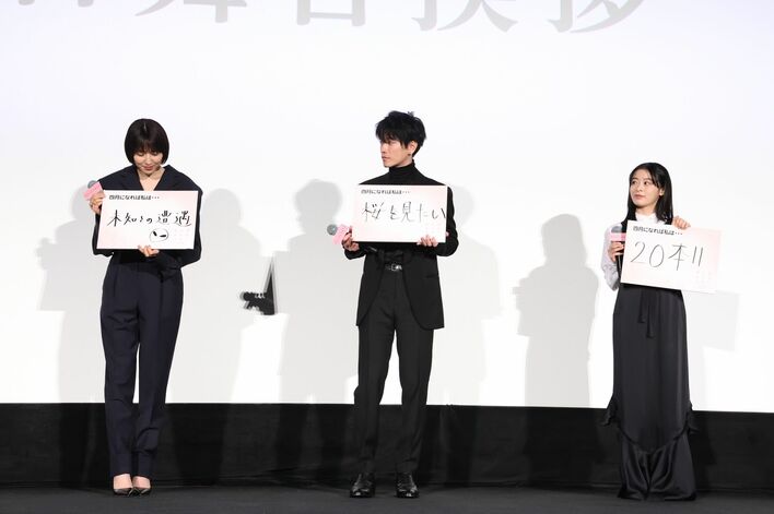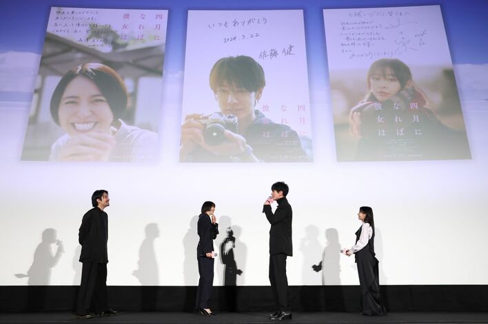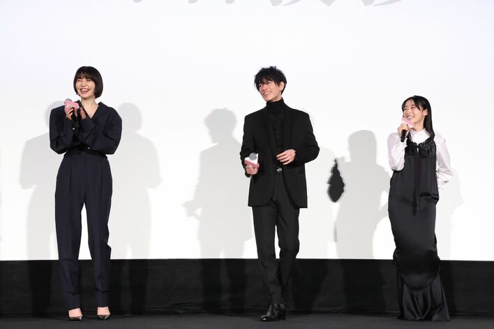 左から)山田智和監督、長澤まさみ、佐藤健、森七菜