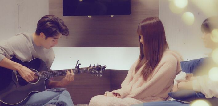 ヒビキ(左)の弾き語りにリリカ(中央)は感激し…
