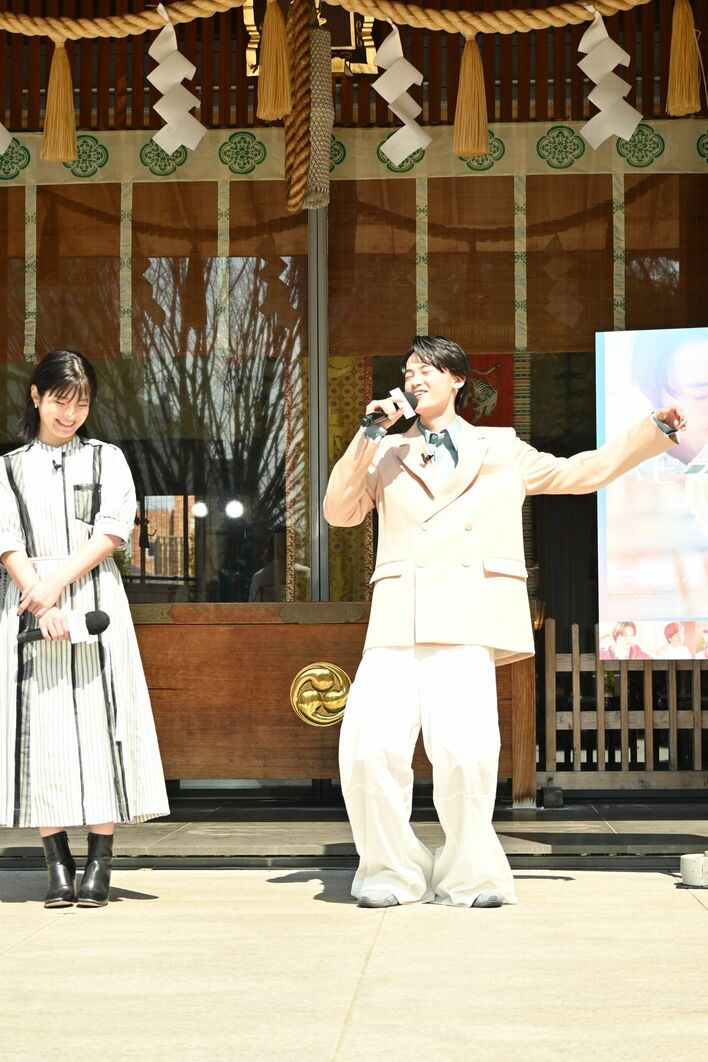 湯船に浸かるジェスチャーをする窪塚愛流(右)と、蒔田彩珠(左)