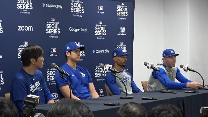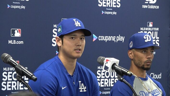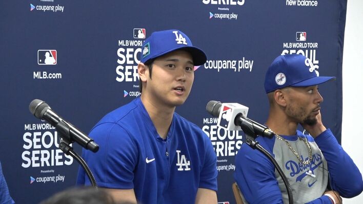 大谷翔平 妻・真美子さんについての質問に照れ笑い「一緒に来て公式戦を見るのは初めて」 韓国でシーズン開幕戦を前に会見