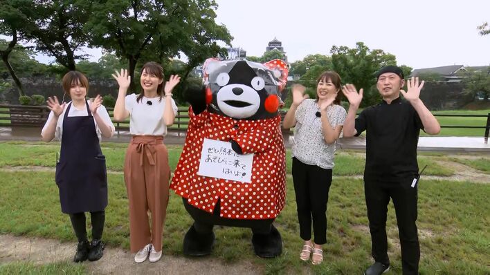 ↑左から)『中国料理 八代飯店』有田恵利花さん・テレビ熊本 仲野香穂アナウンサー・くまモン・緒方由美さん・『まかない家MATSU』松本金男さん